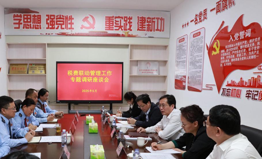 2025 年5 月,国家税务总局山东省税务局党委委员、总会计师李达(右三)到聊城市调研税费联动管理工作,并在基层税务分局讲授党课